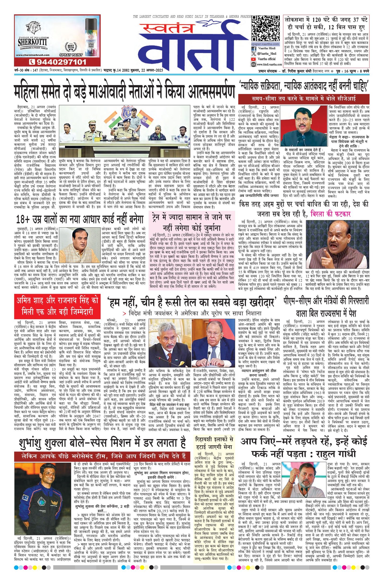 Swatantra Vaartha - 22 Aug 2025 - - Page 1
